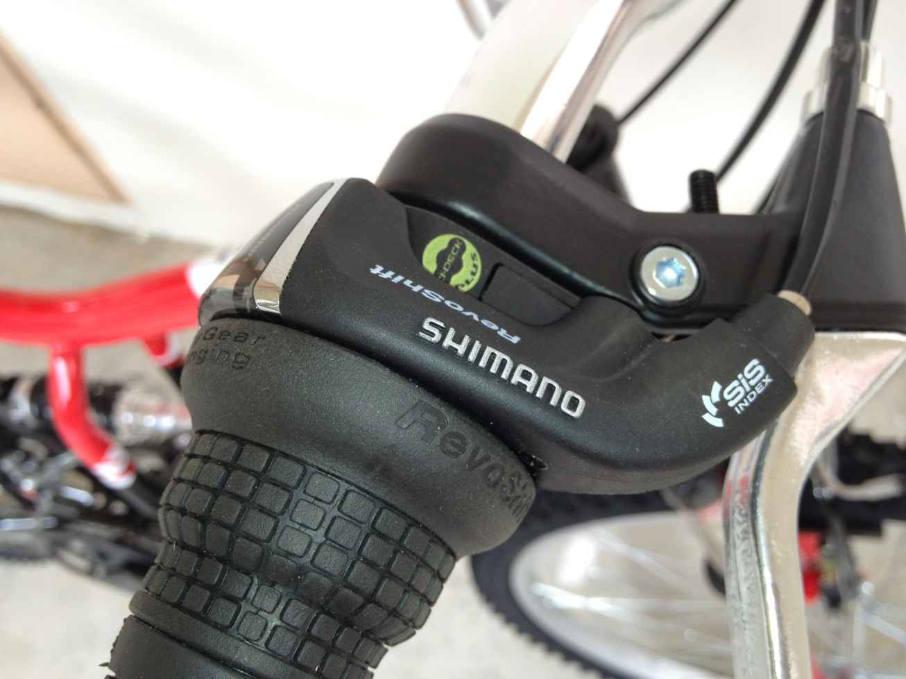 Hi-ten Steel Painted frame, alloy handle, shimano grip shift gear system, 18-Speed shimano qear, alloy rims, alloy pedal and V-brake system.